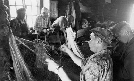 Ämnesord: fiskare, fisknät, fiskarstugor, reparationsarbete |