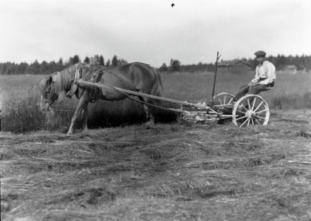 Ämnesord: jordbruk, åkrar, häst, slåtter, hästdragna maskiner, timotej |