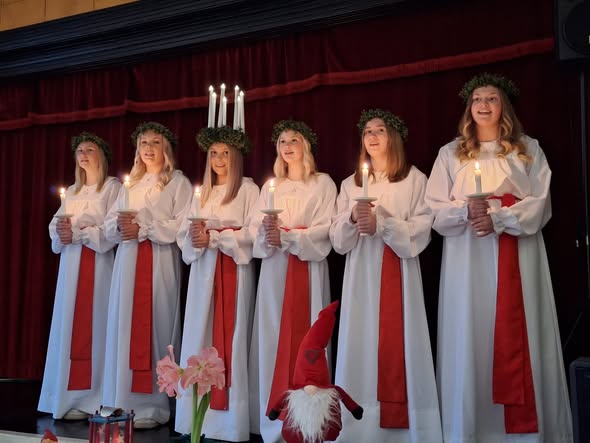 Sista caféträff för i år blev stämningsfull med besök av både luciatåg från Västra Närpes Skola och Närpes lucia med tärnor.
