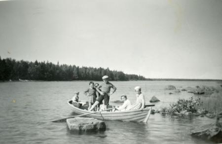 Ämnesord: ungdomar, barn (åldersgrupper), skärgårdar, fäbodar, stränder, lek (aktivitet), roddbåtar |
