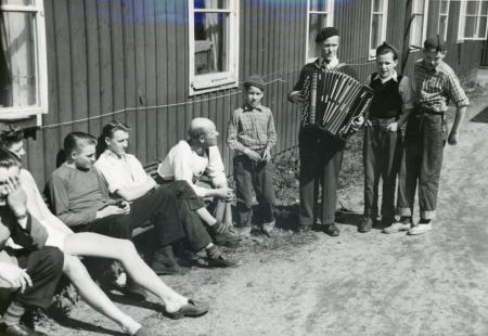 Ämnesord: arbetare, män, pojkar, fritid, varvsindustri, dragspelare, söndag, barackbostäder |