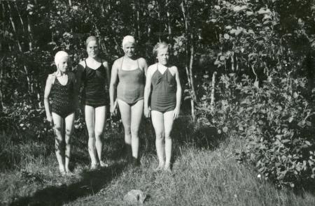 Ämnesord: ungdomsföreningar, sommar, simning, tävlingar, flickor, vatten, stränder, baddräkter, öppet vatten-simning |