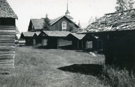 Ämnesord: kyrkobyggnader, häst, stall, timmerbyggnad, pärttak |