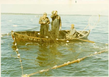 Ämnesord: fiskare, hav, lax, fisknät, roddbåtar, regnkläder |